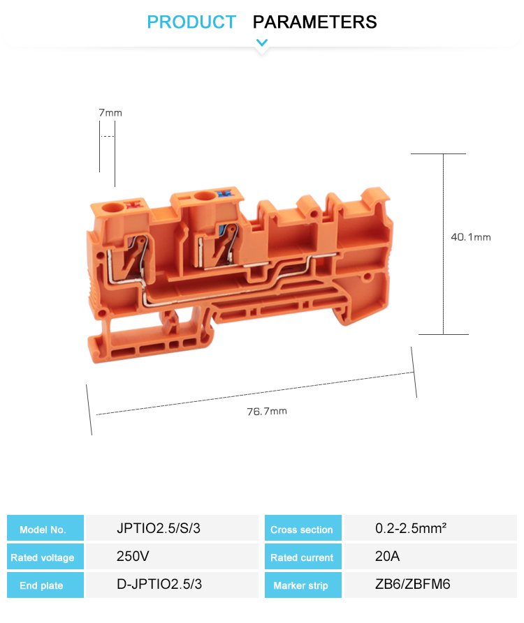 Il ritardante di fiamma in Nylon PA66, il conduttore di ottone e la molla di compressione in acciaio inossidabile vengono utilizzati per garantire una resistenza ad alta temperatura e resistenza alla corrosione del blocco terminali in ambiente duro. La struttura compatta combinata con la progettazione del connettore anteriore ottimizza significativamente l'efficienza di installazione in piccoli spazi.