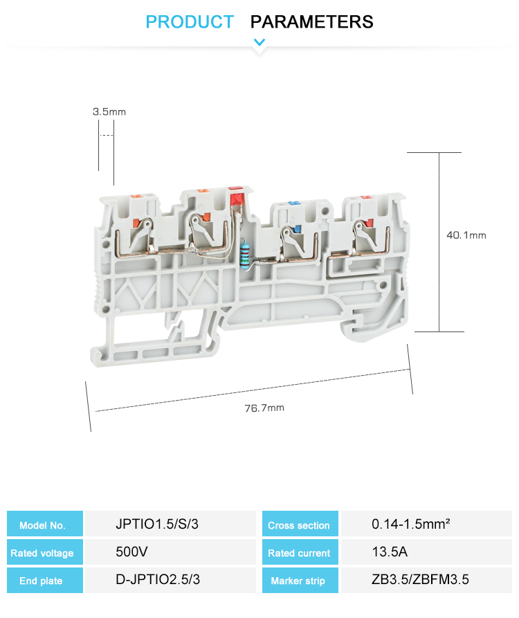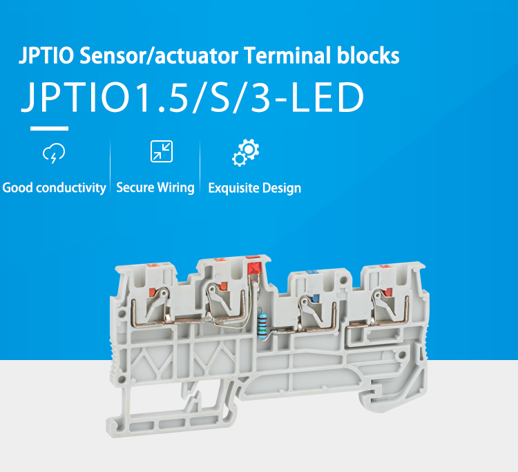 Morsettiera JPTIO1.5/S/3-LED(24V) La morsettiera adotta nylon PA66 ignifugo, conduttore in ottone e molla di compressione in acciaio inossidabile per garantire sicurezza elettrica e resistenza meccanica in condizioni di lavoro difficili.