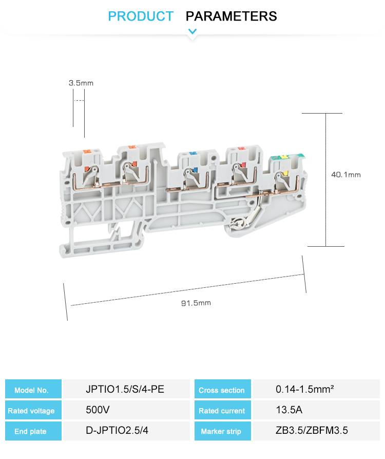 Realizzato in nylon tecnico ignifugo PA66 con vite in ottone.Realizzato in nylon tecnico ignifugo PA66 con vite in ottone.I morsetti di collegamento Push-in sono caratterizzati da un cablaggio semplice e senza attrezzi di conduttori con puntalini o conduttori rigidi.Il design compatto e la connessione frontale consentono il cablaggio in uno spazio ristretto.Oltre alla possibilità di prova nell'albero a doppia funzione, tutti i morsetti forniscono un collegamento di prova aggiuntivo.Con piedino universale che può essere installato su guida Din NS 35.È possibile collegare due conduttori con facilità, anche le sezioni trasversali dei conduttori di grandi dimensioni non sono un problema. La distribuzione del potenziale elettrico può utilizzare ponti fissi al centro del terminale. Tutti i tipi di accessori: copertura terminale, tappo terminale, piastra divisoria, sgancio marcatore, ponte fisso, ponte di inserimento, ecc.
