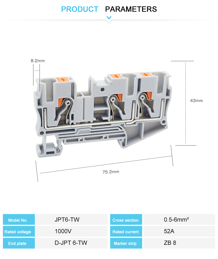 Il terminale multi-conduttore senza viti push-in PT16-T-Wut rivoluzionerà il collegamento elettrico: è possibile ottenere una connessione ferma con una leggera tiro del filo, eliminando la seccatura dello stripping e torcere il filo. Il design del morsetto a molla senza viti elimina l'installazione che richiede tempo e il rischio di allentamento e il meccanismo a molla garantisce una conducibilità affidabile a lungo termine. La capacità di connessione simultanea multi-conduttore ad alta densità si adatta a scenari complessi e ottimizza lo spazio degli armadi di controllo industriale e dei sistemi elettrici commerciali. Si comporta in modo eccezionale in scenari come il miglioramento dell'efficienza del cablaggio delle apparecchiature industriali, l'installazione compatta negli spazi commerciali e la riduzione dei tempi di inattività durante la manutenzione. È una scelta efficiente e affidabile per ingegneri e installatori.