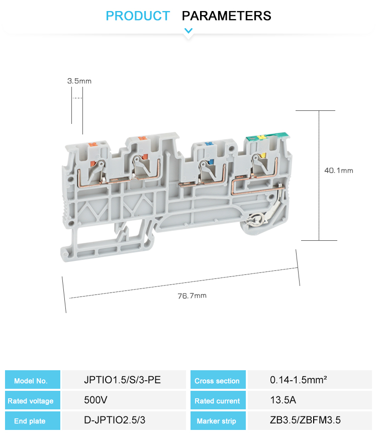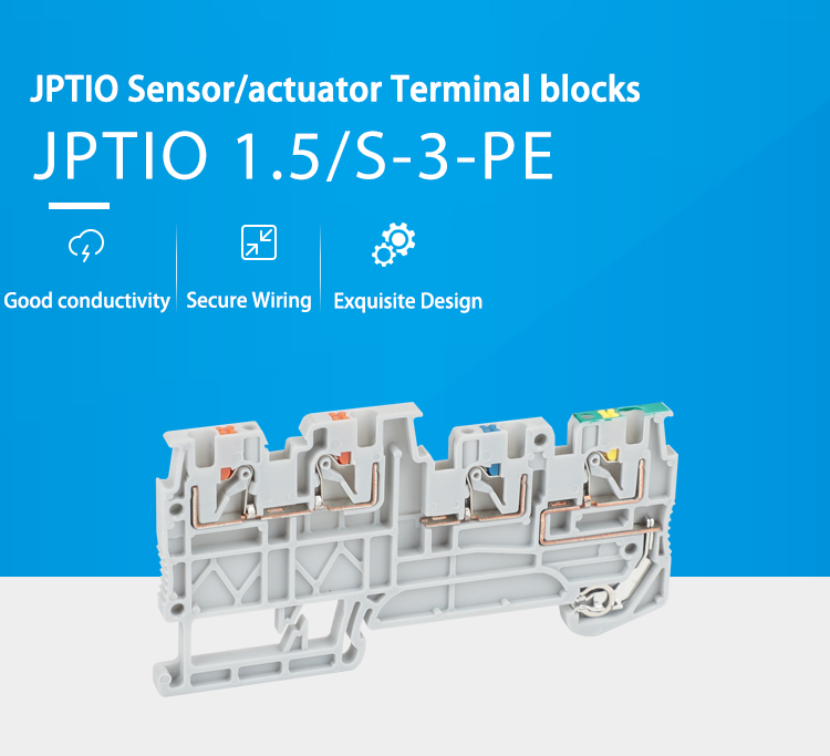 morsettiera JPTIO1.5/S/3-PE La morsettiera adotta nylon PA66 ignifugo, conduttore in ottone e molla di compressione in acciaio inossidabile per garantire sicurezza elettrica e resistenza meccanica in condizioni di lavoro difficili.